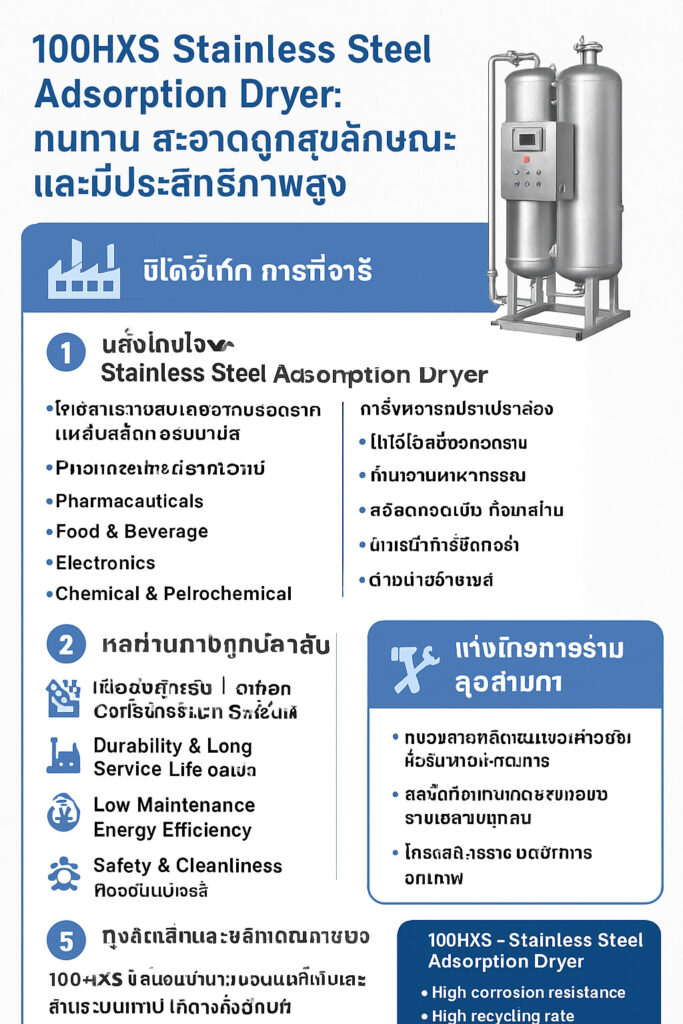 100HXS Stainless Steel Adsorption Dryer ไม่ใช่เพียงเครื่องอบลม แต่เป็นส่วนสำคัญในการยกระดับคุณภาพการผลิตให้ สะอาด ประสิทธิภาพสูง และปราศจากการปนเปื้อน