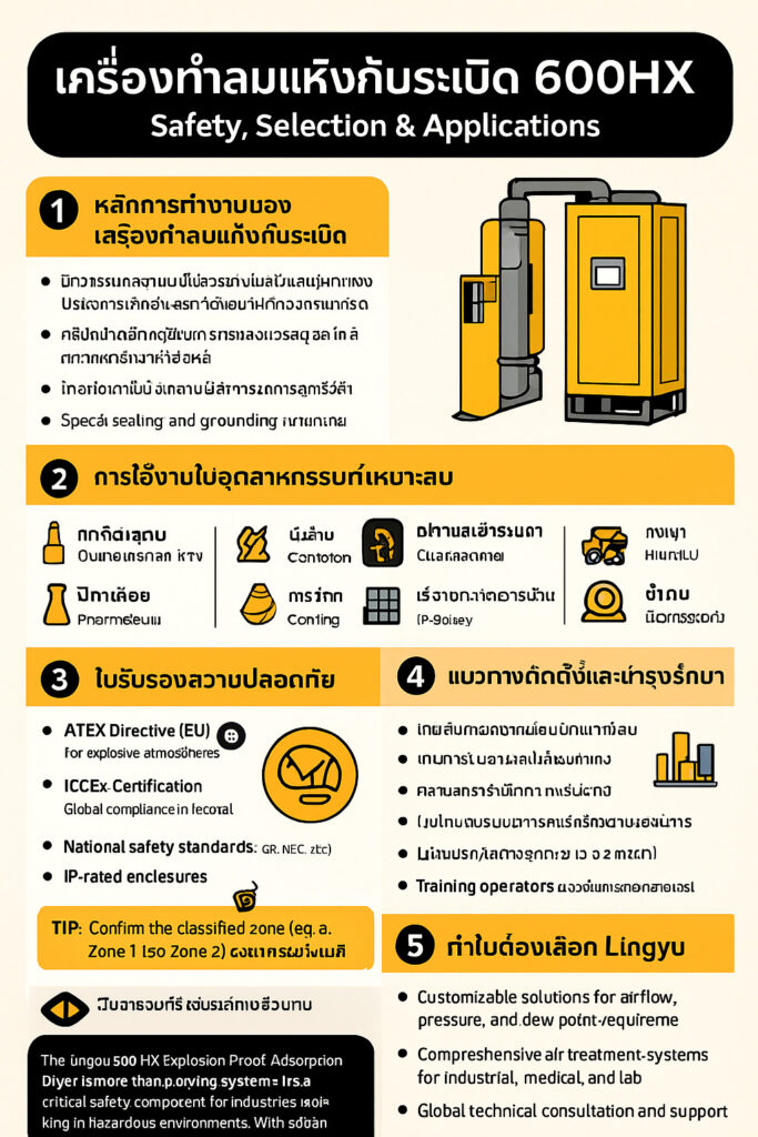 เครื่องทำลมแห้งดูดซับกันระเบิดรุ่น 600HX Explosion-Proof Adsorption Dryer ถูกออกแบบมาสำหรับสภาพแวดล้อมอุตสาหกรรมที่มีความเสี่ยงสูง ซึ่งอาจมีแก๊สไวไฟหรือฝุ่นที่ก่อให้เกิดการระเบิดได้ แม้ว่าสเปกทางเทคนิคจะครอบคลุมประสิทธิภาพ ความจุ และเงื่อนไขการทำงาน แต่สิ่งที่ผู้ใช้งานกังวลมากที่สุดคือ มาตรฐานความปลอดภัย การเลือกใช้งาน การติดตั้ง และความน่าเชื่อถือในระยะยาว