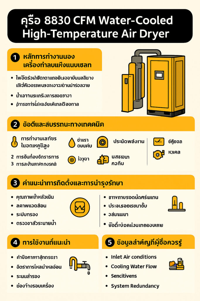 ในงานอุตสาหกรรมขนาดใหญ่ การมีลมอัดที่สะอาดและปราศจากความชื้นเป็นสิ่งสำคัญ เพื่อปกป้องเครื่องจักร ควบคุมคุณภาพสินค้า และเพิ่มประสิทธิภาพการผลิต เครื่องทำลมแห้งแบบทำความเย็นระบบน้ำ 8830 CFM Water-Cooled Air Dryer ถูกออกแบบมาสำหรับระบบที่มีปริมาณลมสูงและต้องทำงานต่อเนื่อง ให้ค่าดิวพอยต์คงที่และประหยัดพลังงานแม้อยู่ในสภาพแวดล้อมที่ท้าทาย