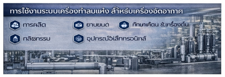 ในการใช้งานทั้งหมดนี้ คุณภาพของลมอัดมีผลโดยตรงต่อสภาพของอุปกรณ์ ความเสถียรของการทำงาน และประสิทธิภาพการผลิต นี่จึงเป็นเหตุผลว่าทำไมการเลือกระบบทำลมแห้งสำหรับเครื่องอัดอากาศ (Air Dryer System for Air Compressors) ที่เหมาะสมจึงมีความสำคัญอย่างมาก