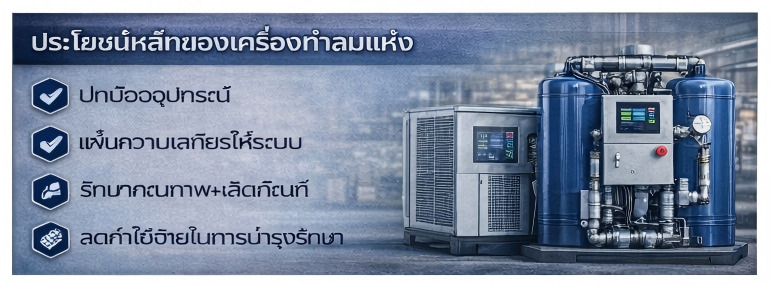 การใช้ระบบทำลมแห้ง (Air Dryer System) มอบข้อดีสำคัญหลายประการให้แก่ผู้ใช้งานในภาคอุตสาหกรรม