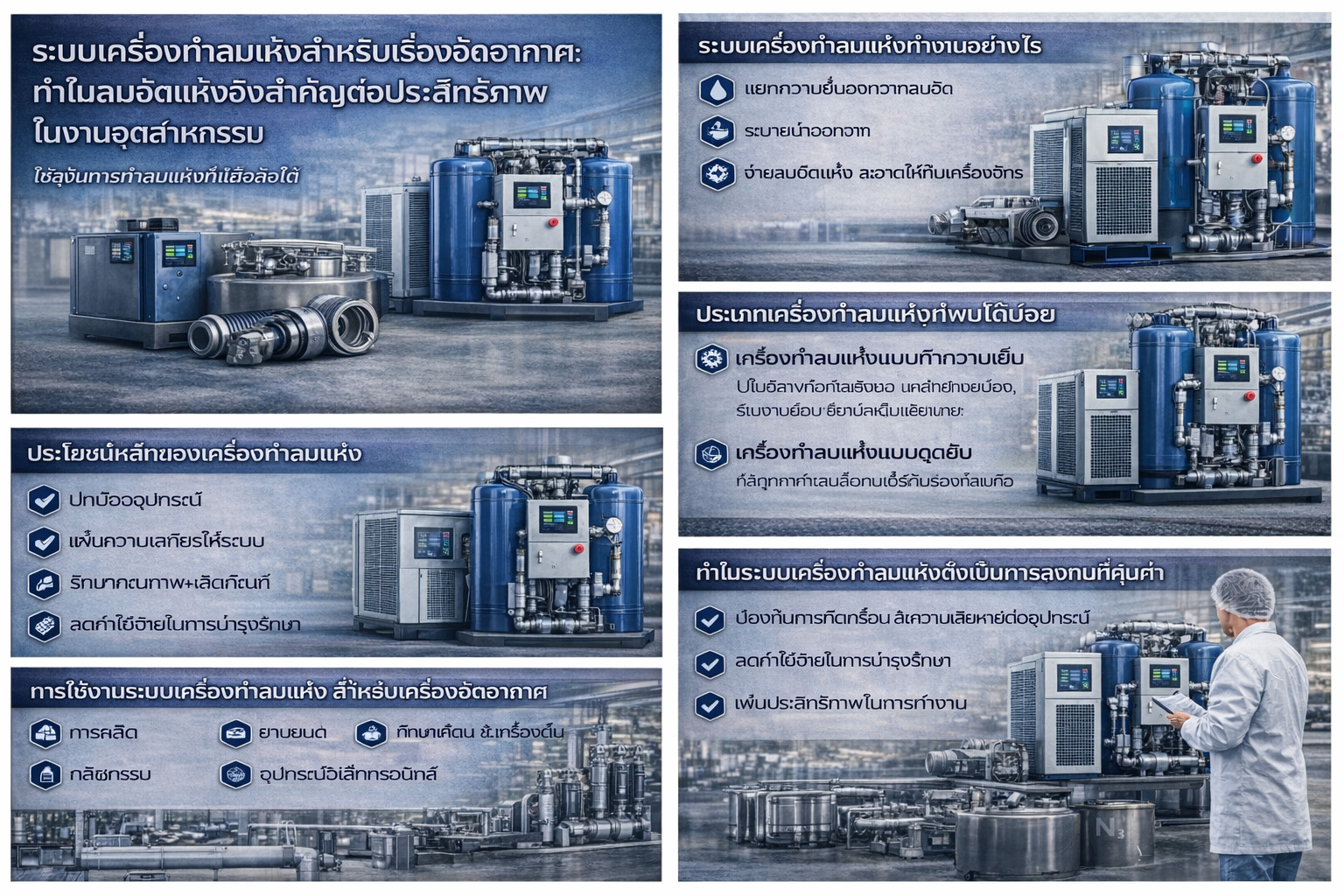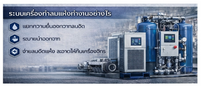 ระบบทำลมแห้งสำหรับเครื่องอัดอากาศ (Air Dryer System for Air Compressors) เป็นส่วนสำคัญของโซลูชันการปรับปรุงคุณภาพลมอัดแบบครบระบบ โดยมีหน้าที่หลักในการกำจัดความชื้นออกจากลมอัด ก่อนที่ลมจะถูกส่งต่อไปยังอุปกรณ์ปลายทาง ระบบท่อ เครื่องมือลม หรือกระบวนการผลิต