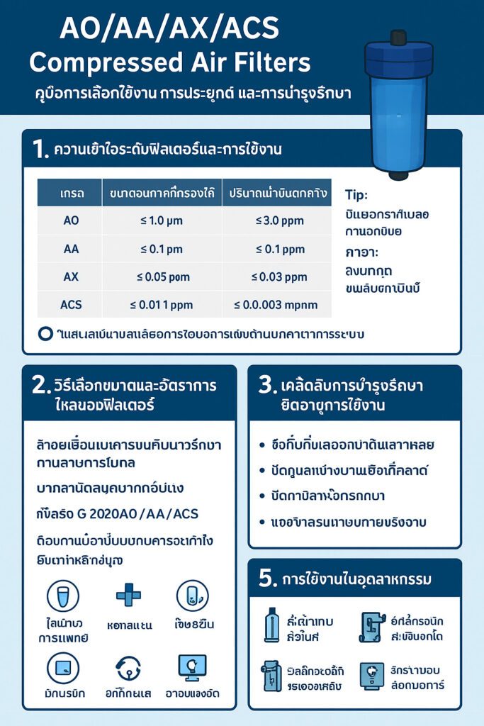 การเลือก AO, AA, AX หรือ ACS Compressed Air Filters ไม่ได้เป็นเพียงการเลือกตามสเปก แต่คือการปกป้องอุปกรณ์ และยกระดับคุณภาพอากาศ พร้อมเพิ่มประสิทธิภาพการทำงานของระบบโดยรวม การเลือกถูกต้องและดูแลอย่างเหมาะสม จะทำให้ระบบลมทำงานได้อย่างเสถียรในระยะยาว