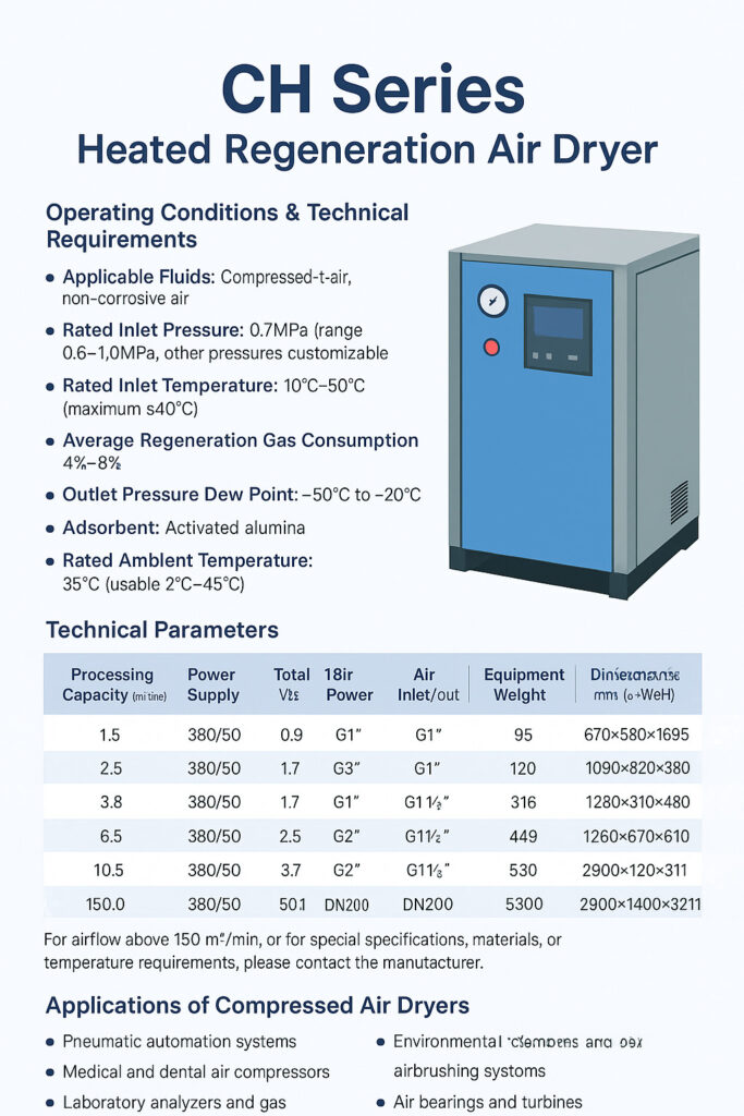 CH Series เป็นโซลูชันที่มีประสิทธิภาพสูงและเชื่อถือได้สำหรับการอบแห้งลมอัดหรือก๊าซที่ไม่กัดกร่อน ถูกออกแบบมาเพื่อรองรับการใช้งานในงานอุตสาหกรรมและงานระดับมืออาชีพ ช่วยให้ได้ค่า Outlet Dew Point ต่ำเป็นพิเศษ เพื่อตอบสนองความต้องการของกระบวนการผลิตที่เข้มงวด