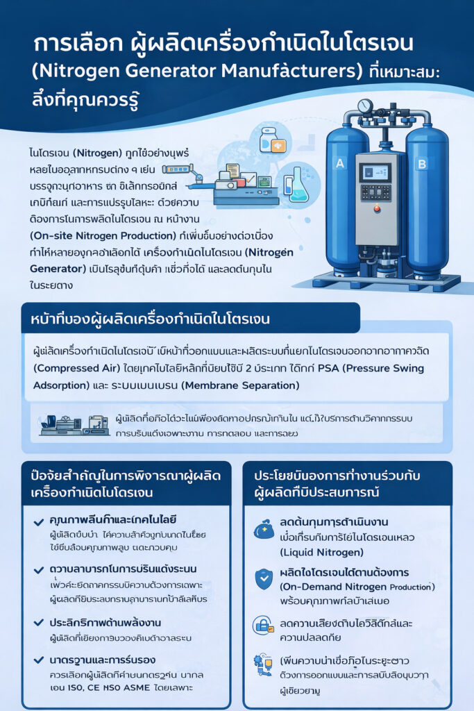 การเลือก ผู้ผลิตเครื่องกำเนิดไนโตรเจน (Nitrogen Generator Manufacturers) ที่เหมาะสมจึงเป็นการตัดสินใจที่สำคัญ ซึ่งส่งผลโดยตรงต่อประสิทธิภาพของระบบ ต้นทุนการดำเนินงาน และความน่าเชื่อถือในระยะยาว