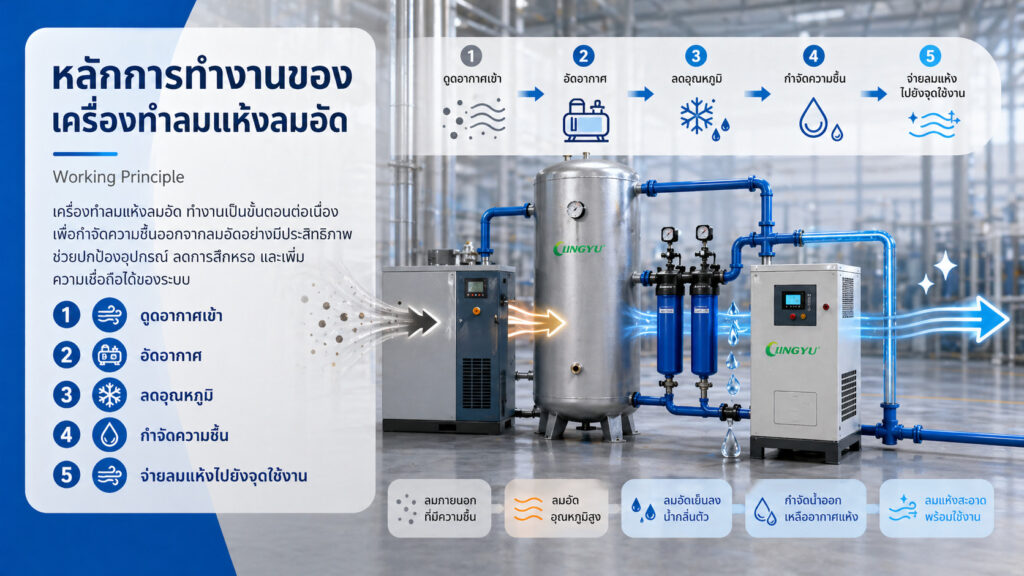 หลักการพื้นฐานของ Compressed Air Dryer Working นั้นเรียบง่าย คือ กำจัดความชื้นออกจากลมอัดก่อนที่ความชื้นนั้นจะสร้างความเสียหายต่อระบบหรือรบกวนกระบวนการผลิต วิธีการที่ใช้จริงจะขึ้นอยู่กับชนิดของเครื่องทำลมแห้ง แต่เครื่องทุกประเภทล้วนถูกออกแบบมาเพื่อแยกหรือดูดซับไอน้ำ เพื่อให้ลมขาออกแห้งกว่าลมขาเข้าอย่างมาก