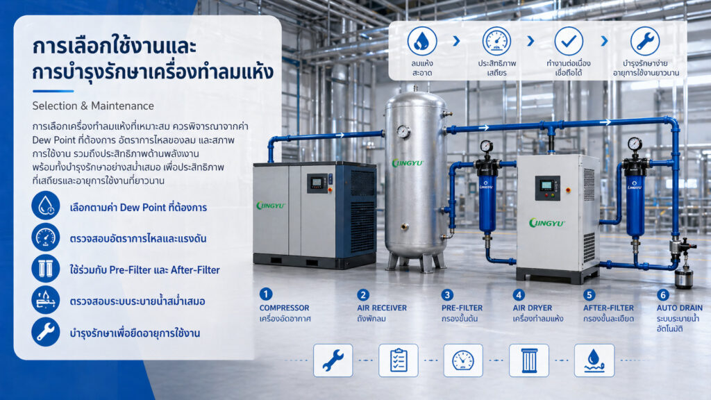 การเลือกเครื่องทำลมแห้งที่เหมาะสมขึ้นอยู่กับหลายปัจจัย ปัจจัยแรกคือค่าจุดน้ำค้างภายใต้ความดันที่ต้องการ หากเป็นเพียงลมแห้งสำหรับงานอุตสาหกรรมทั่วไป เครื่องทำลมแห้งแบบทำความเย็นอาจเพียงพอ แต่หากกระบวนการไวต่อความชื้นหรืออยู่ในสภาพแวดล้อมที่ต้องควบคุมความแห้งอย่างเข้มงวด เครื่องทำลมแห้งแบบดูดซับอาจเป็นตัวเลือกที่ดีกว่า