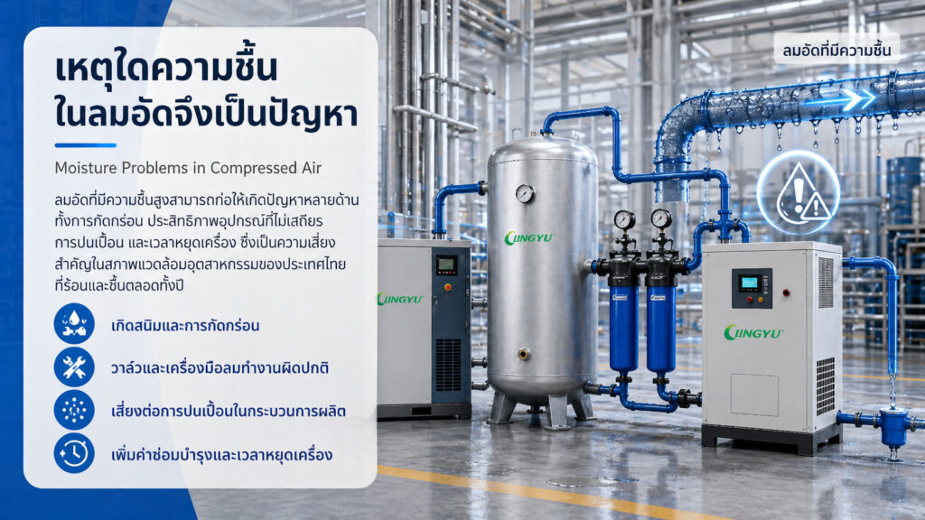 สำหรับโรงงานในประเทศไทย เรื่องนี้ยิ่งมีความสำคัญมากขึ้น เพราะสภาพอากาศร้อนชื้น ความชื้นสัมพัทธ์สูงตลอดปี และในหลายพื้นที่อุตสาหกรรมยังอยู่ใกล้ทะเลหรือมีฤดูฝนยาวนาน ซึ่งล้วนเพิ่มภาระให้กับระบบลมอัดและทำให้การควบคุมความชื้นมีความสำคัญยิ่งขึ้น