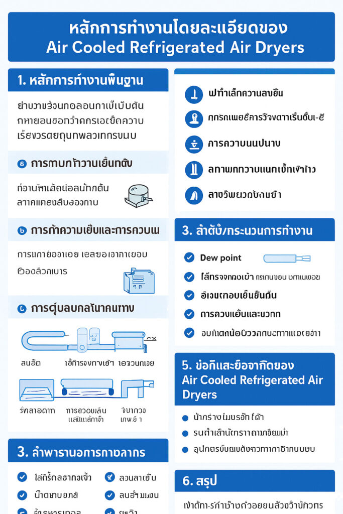 Air Cooled Refrigerated Air Dryers ทำหน้าที่กำจัดความชื้นในลมอัดโดยการทำความเย็นให้ต่ำกว่าจุดน้ำค้าง แล้วระบายน้ำที่ควบแน่นออก จุดเด่นคือไม่ต้องใช้น้ำและดูแลรักษาง่าย ส่วนข้อจำกัดคือไวต่ออุณหภูมิโดยรอบและมีขีดจำกัดของจุดน้ำค้างขั้นต่ำ การเข้าใจหลักการทำงานอย่างถูกต้องจะช่วยให้เลือกใช้งานได้เหมาะสม เพิ่มประสิทธิภาพของกระบวนการผลิต และยืดอายุการใช้งานของอุปกรณ์ในระบบลมอัดได้อย่างมีประสิทธิภาพ