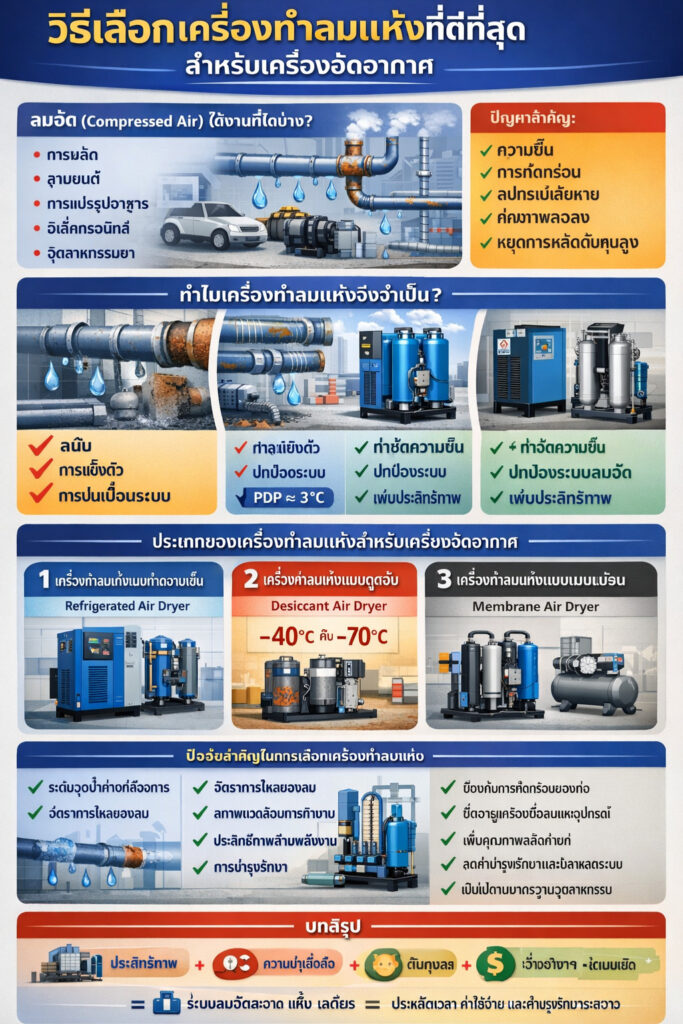 ดังนั้น การเลือก เครื่องทำลมแห้งสำหรับเครื่องอัดอากาศ (Air Dryer for Air Compressor) ที่เหมาะสมจึงเป็นสิ่งสำคัญ เพื่อให้ได้ลมอัดที่สะอาด แห้ง และมีความเสถียร