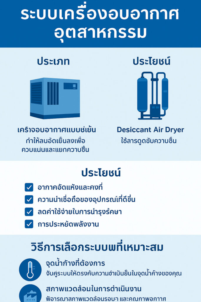 Industrial Air Dryer Systems คือระบบสำคัญในระบบลมอัดอุตสาหกรรม มีหน้าที่กำจัดความชื้น ไอน้ำ และสิ่งปนเปื้อนออกจากลมอัด เพื่อให้ได้ลมที่แห้ง สะอาด และมีคุณภาพสม่ำเสมอ