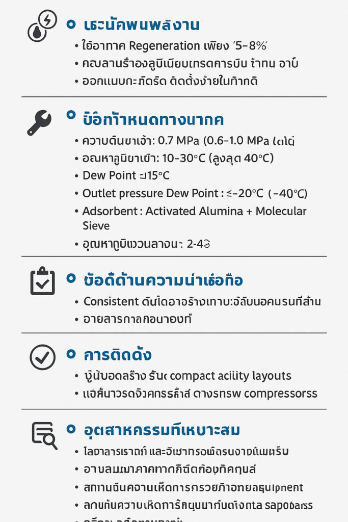 กระบวนการ Regeneration ใช้อากาศเพียง 5%–8% ของปริมาณลมที่ผ่านการทำแห้ง ช่วยลดต้นทุนการดำเนินงานอย่างมาก พร้อมรักษาค่า Dew Point ให้คงที่