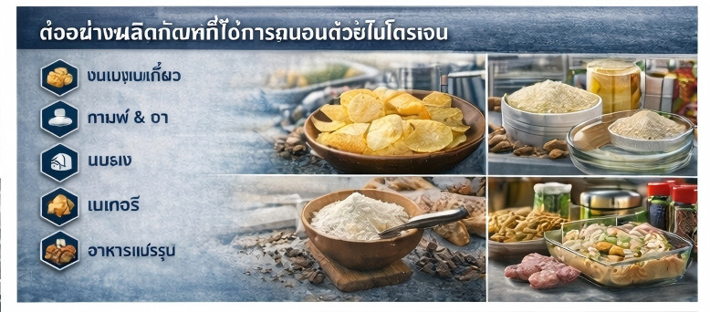 การถนอมอาหารด้วยไนโตรเจน (Nitrogen Food Preservation) ถูกใช้อย่างแพร่หลายในหลายภาคส่วนของอุตสาหกรรมอาหาร โดยเฉพาะอย่างยิ่งเหมาะสำหรับผลิตภัณฑ์ที่ไวต่อออกซิเจน ความชื้น หรือความเสียหายทางกายภาพ