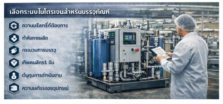 การเลือกโซลูชันไนโตรเจนที่เหมาะสมขึ้นอยู่กับชนิดของผลิตภัณฑ์ รูปแบบบรรจุภัณฑ์ และข้อกำหนดด้านการผลิต โดยควรพิจารณาปัจจัยหลายประการ ดังนี้