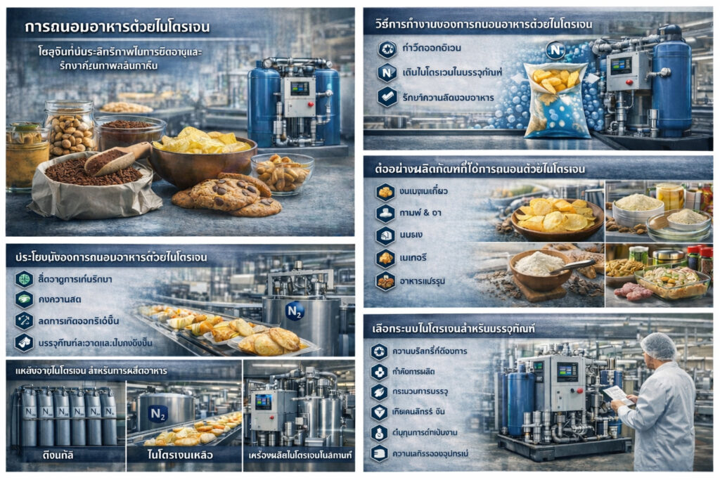 ในอุตสาหกรรมอาหารปัจจุบัน การรักษาความสดใหม่ การคงคุณภาพของผลิตภัณฑ์ และการยืดอายุการเก็บรักษา เป็นสิ่งสำคัญอย่างยิ่งทั้งสำหรับผู้ผลิตและผู้บริโภค เมื่อเทคโนโลยีบรรจุภัณฑ์มีการพัฒนาอย่างต่อเนื่อง การถนอมอาหารด้วยไนโตรเจน (Nitrogen Food Preservation) จึงกลายเป็นหนึ่งในวิธีที่มีประสิทธิภาพมากที่สุดในการปกป้องผลิตภัณฑ์อาหารหลากหลายประเภทระหว่างการจัดเก็บ การขนส่ง และการวางจำหน่าย