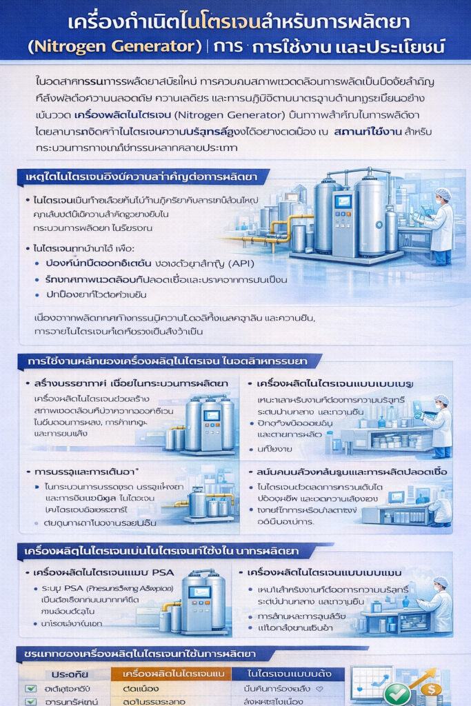 เครื่องผลิตไนโตรเจน (Nitrogen Generator) มีบทบาทสำคัญในการผลิตยา โดยสามารถจัดหาไนโตรเจนความบริสุทธิ์สูงได้อย่างต่อเนื่อง ณ สถานที่ใช้งาน สำหรับกระบวนการทางเภสัชกรรมหลากหลายประเภท