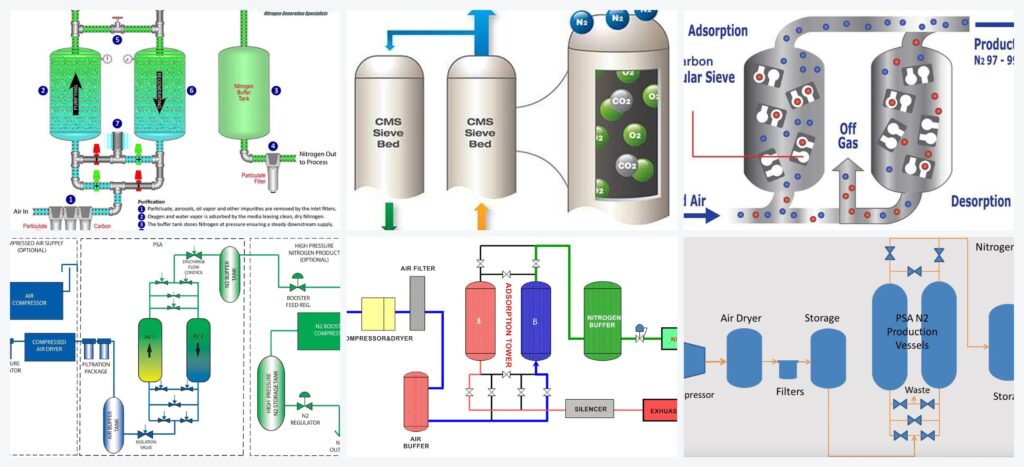 PSA Nitrogen Generator ใช้วัสดุ Carbon Molecular Sieve เพื่อดูดซับออกซิเจน ทำให้ไนโตรเจนผ่านออกมาเป็นก๊าซผลิตภัณฑ์