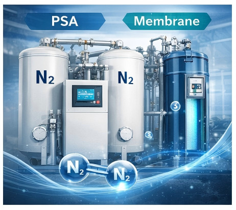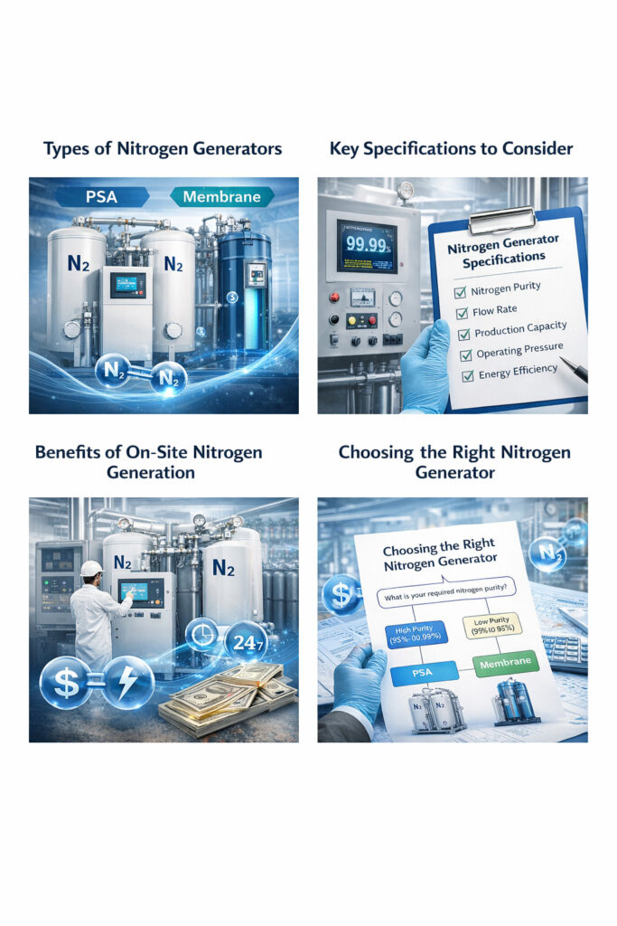 เครื่องผลิตไนโตรเจน (Nitrogen Generator) คือระบบที่แยกไนโตรเจนออกจากอากาศอัด และส่งจ่ายไปยังจุดใช้งานโดยตรง เทคโนโลยีที่ใช้กันอย่างแพร่หลายที่สุดคือ PSA (Pressure Swing Adsorption) และ ระบบผลิตไนโตรเจนแบบเมมเบรน (Membrane Nitrogen Generation)
