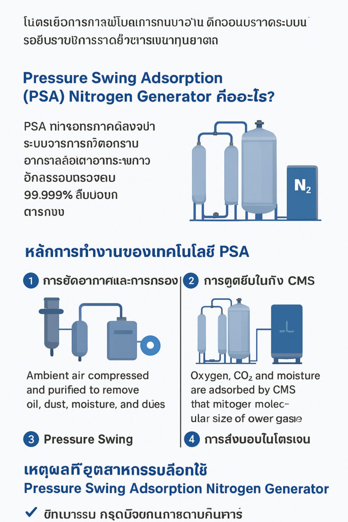 เมื่ออุตสาหกรรมต้องการไนโตรเจนความบริสุทธิ์สูงในต้นทุนการดำเนินงานที่ต่ำกว่า Pressure Swing Adsorption Nitrogen Generator ได้กลายเป็นโซลูชันที่ได้รับความนิยมอย่างกว้างขวาง แทนที่จะต้องพึ่งพาการส่งมอบไนโตรเจนแบบถังหรือการเช่าซิลินเดอร์ราคาแพง ธุรกิจสามารถผลิตไนโตรเจนใช้เองได้แบบ on-site และ on-demand อย่างมีประสิทธิภาพ