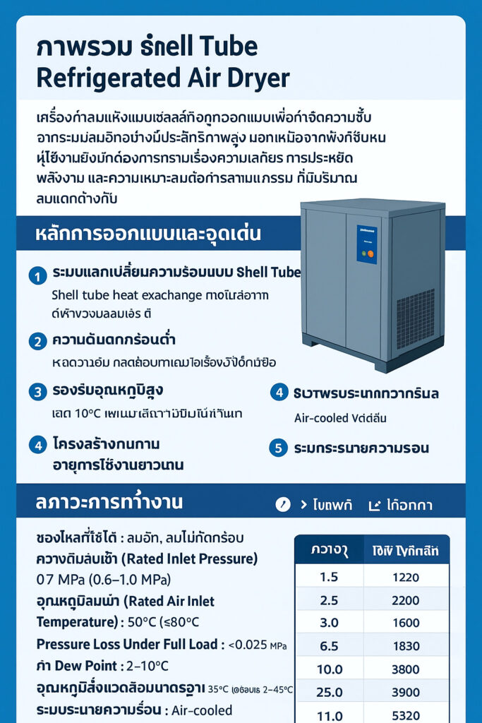 เครื่องทำลมแห้งแบบเชลล์ท่อ (Shell Tube Refrigerated Air Dryer) ถูกออกแบบมาเพื่อกำจัดความชื้นในระบบลมอัดอย่างมีประสิทธิภาพสูง นอกเหนือจากฟังก์ชันหลัก ผู้ใช้งานยังมักต้องการทราบเรื่องความเสถียร การประหยัดพลังงาน และความเหมาะสมต่อการใช้งานในอุตสาหกรรมที่มีปริมาณลมแตกต่างกัน