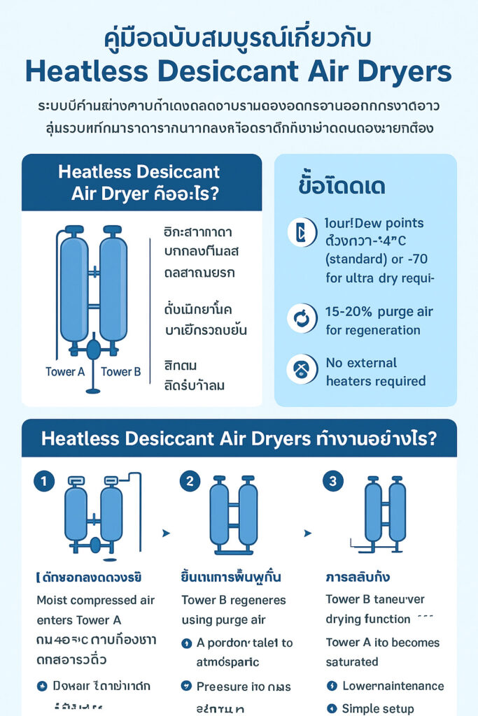 คู่มือฉบับนี้จะอธิบายหลักการทำงาน ข้อดี ข้อจำกัด การใช้งาน และสิ่งที่ต้องพิจารณาในการเลือก Heatless Desiccant Air Dryer ให้เหมาะสมกับระบบของคุณ