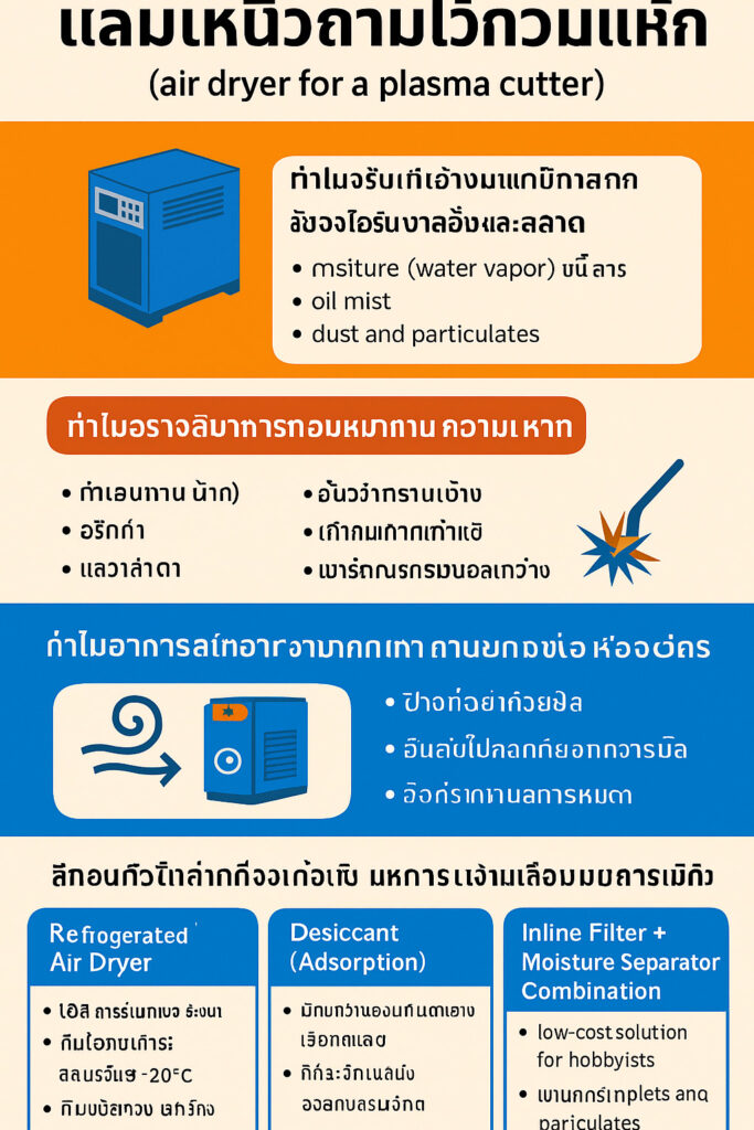 หากคุณใช้เครื่องตัดพลาสมา ไม่ว่าจะในเวิร์กชอป โรงงาน หรือโรงรถ คุณจะรู้ดีว่า “ลมอัดที่สะอาดและแห้ง” มีความสำคัญแค่ไหนต่อการตัดที่เรียบ สวย และแม่นยำ แต่หลายคนมักประเมินผลกระทบของความชื้นต่ำเกินไป—จนกระทั่งเกิดปัญหา เช่น ลมพลาสมาไม่นิ่ง เกิดสะเก็ดโลหะ (dross) มาก คุณภาพการตัดแย่ลง หรือหัวตัดและหัวฉีดสึกหรอเร็วผิดปกติ