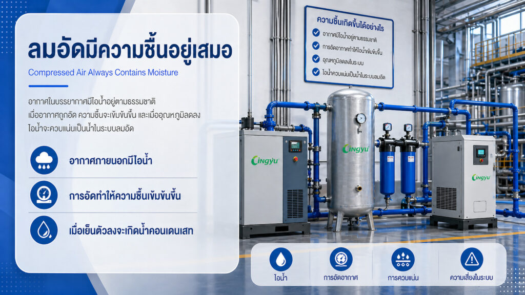 ดังนั้น คำถามที่แท้จริงไม่ใช่ว่า “ลมอัดมีความชื้นหรือไม่” เพราะมีแน่นอน แต่คือ “จะกำจัดความชื้นนั้นอย่างมีประสิทธิภาพได้อย่างไร”