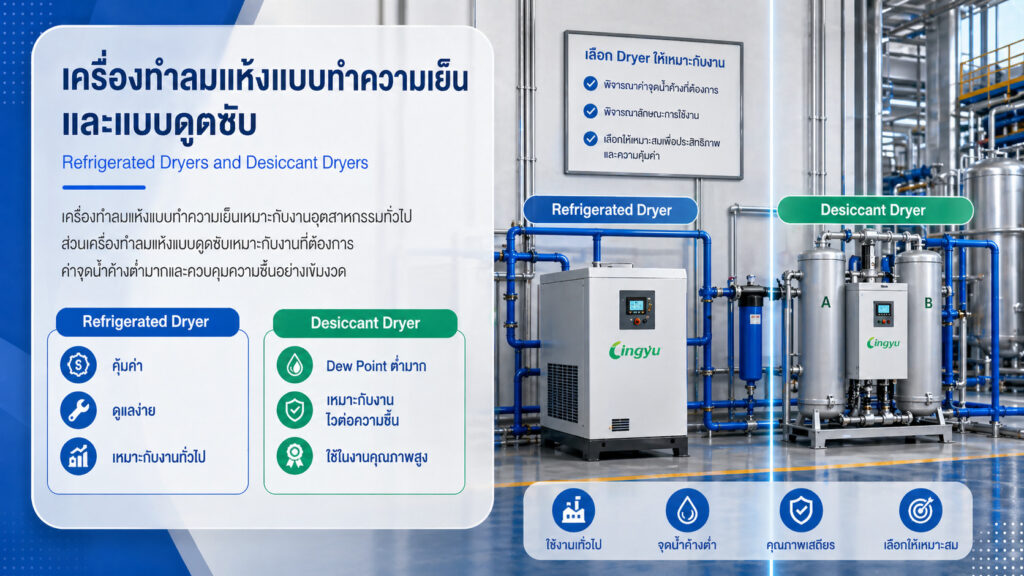 ในทางปฏิบัติ ระบบลมอัดอุตสาหกรรมส่วนใหญ่จำเป็นต้องใช้เครื่องทำลมแห้ง คำถามจริงจึงไม่ใช่ว่า “จำเป็นต้องทำลมแห้งหรือไม่” แต่คือ “ควรใช้เครื่องทำลมแห้งประเภทใดจึงจะเหมาะสมที่สุด”