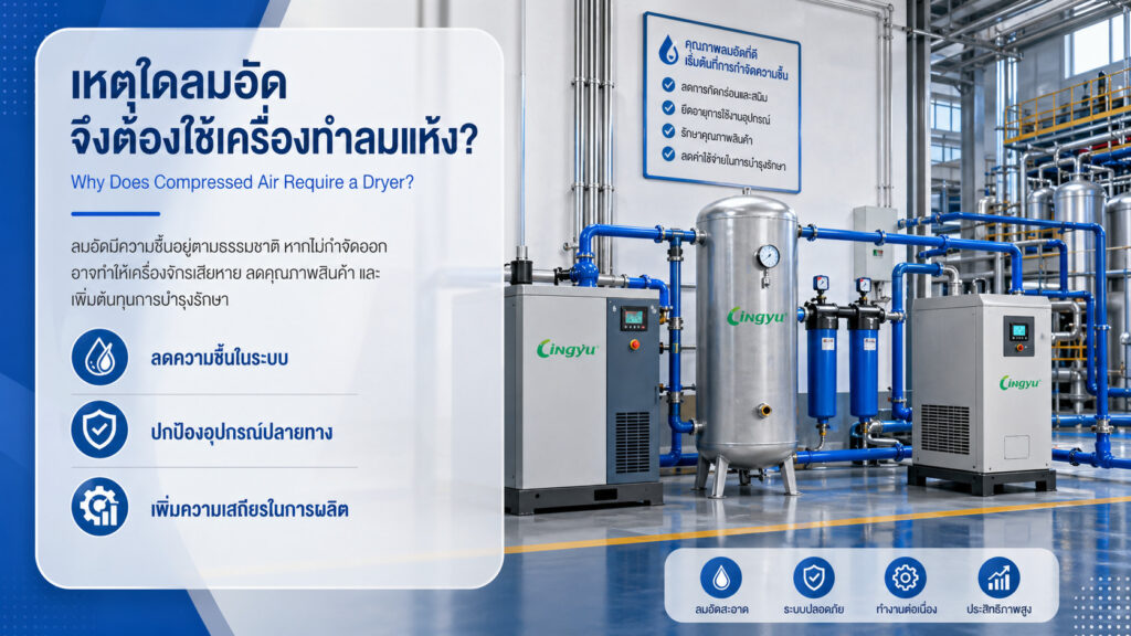ลมอัด (Compressed Air) มักถูกเรียกว่าเป็น “สาธารณูปโภคอันดับที่สี่” ของภาคอุตสาหกรรม เพราะถูกใช้งานอย่างกว้างขวางในกระบวนการประจำวันมากมาย ไม่ว่าจะเป็นการขับเคลื่อนเครื่องมือลม การสนับสนุนระบบอัตโนมัติ การควบคุมวาล์วและเครื่องมือวัด รวมถึงช่วยให้สายการผลิตทำงานได้อย่างราบรื่น อย่างไรก็ตาม ผู้ใช้งานจำนวนมากยังคงมีคำถามสำคัญว่า เหตุใดลมอัดจึงต้องใช้เครื่องทำลมแห้ง (Why Does Compressed Air Require a Dryer?)