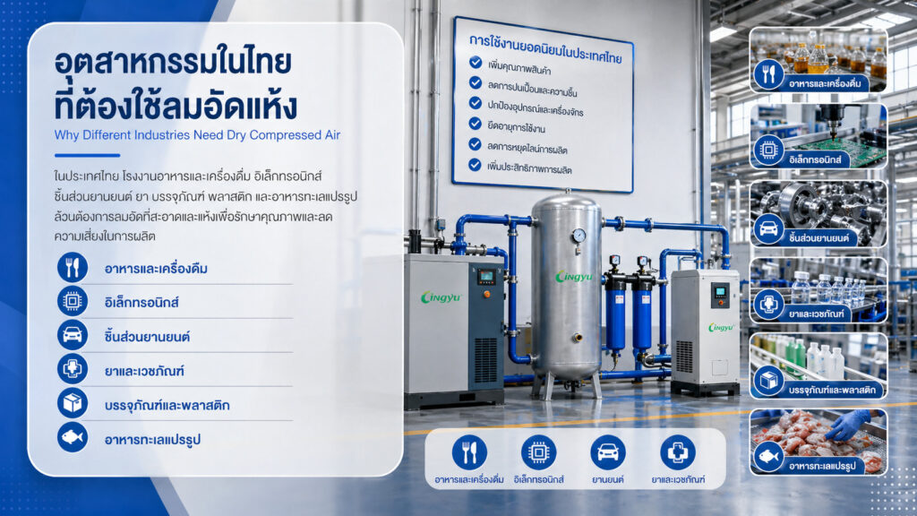 ในประเทศไทย ปัญหานี้พบได้บ่อยในโรงงานแปรรูปอาหาร โรงงานเครื่องดื่ม โรงงานแช่แข็ง โรงงานอิเล็กทรอนิกส์ โรงงานชิ้นส่วนยานยนต์ โรงงานยา รวมถึงโรงงานเคมีและบรรจุภัณฑ์ เพราะล้วนต้องการคุณภาพลมที่มีเสถียรภาพและควบคุมความชื้นได้ดี