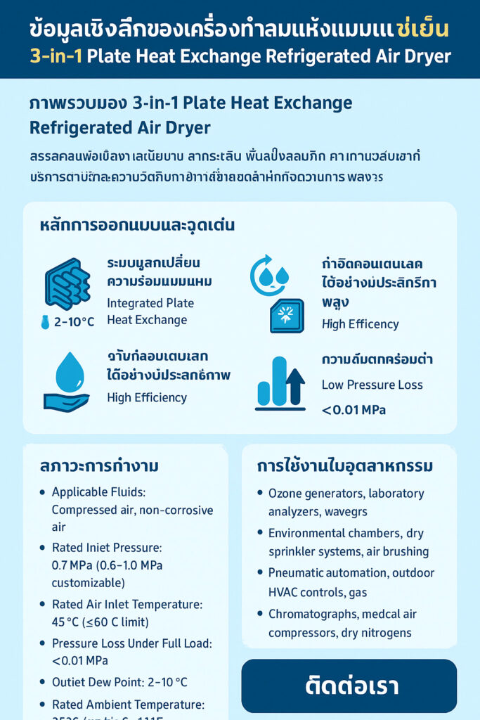 เครื่องทำลมแห้งแบบแช่เย็น 3-in-1 รุ่น Plate Heat Exchange ผสานกระบวนการ pre-cooling, refrigeration และ condensation ไว้ในเครื่องเดียวที่มีขนาดกะทัดรัด นอกจากการทำงานพื้นฐานแล้ว ผู้ใช้งานยังให้ความสำคัญด้าน ประสิทธิภาพการประหยัดพลังงาน, ความเสถียรของ dew point, และความเหมาะสมกับการใช้งานอุตสาหกรรมหลากหลายประเภท